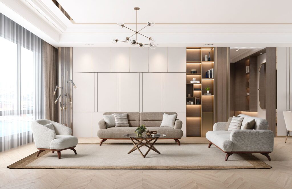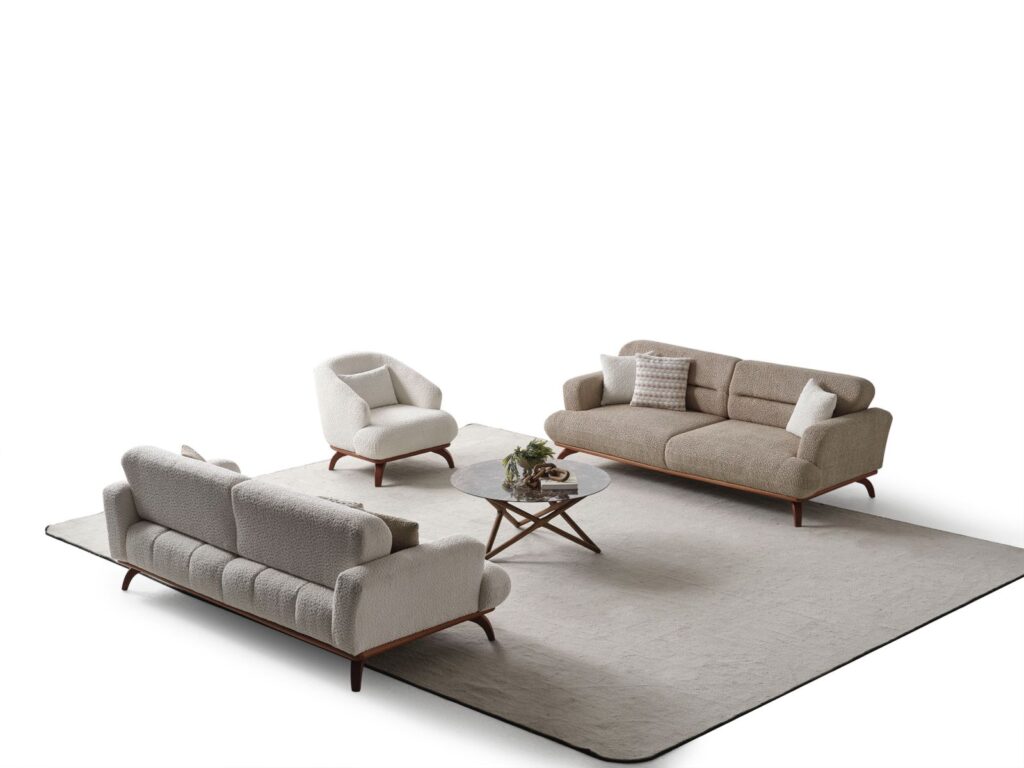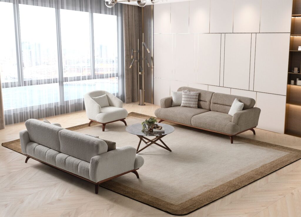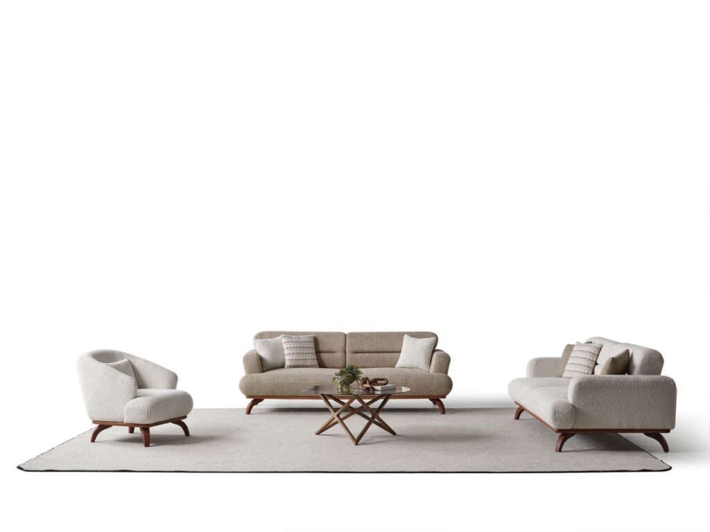 Şık ahşap ayakları, geniş oturum alanı ve yumuşak döşemesiyle gündelik kullanımı kolaylaştıran bu takım, salonunuza sıcak ve dengeli bir görünüm kazandırıyor.